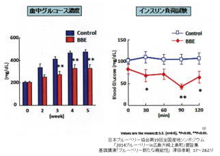 津田先生の研究グループは、糖尿病のマウスに北欧産野生種ブルーベリー抽出物を与えたところ、様々な細胞で糖質の取り込みが促進し、また、肝臓での糖質の生み出しを抑制することがわかりました。これらのことに伴い、血糖値を低下させました。さらに、北欧産野生種ブルーベリーには、インスリンに対しての働きを促すことが出来ることがわかりました!
